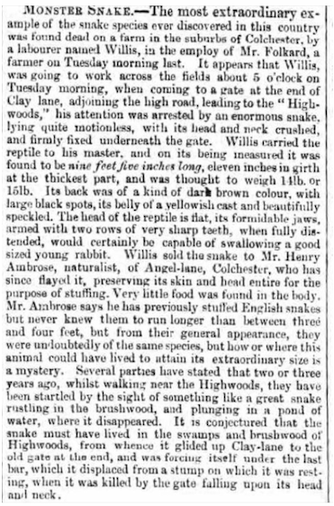 The most extraordinary example of the snake species ever discovered in this country was found dead on a farm in the suburbs of Colchester, by a labourer named Willis, in the employ of Mr. Folkard, a farmer on Tuesday morning last.