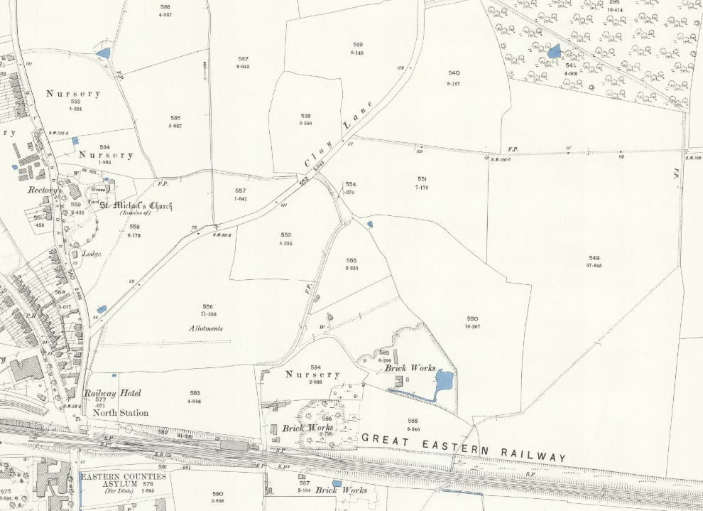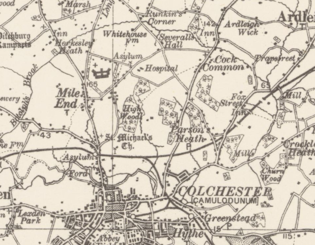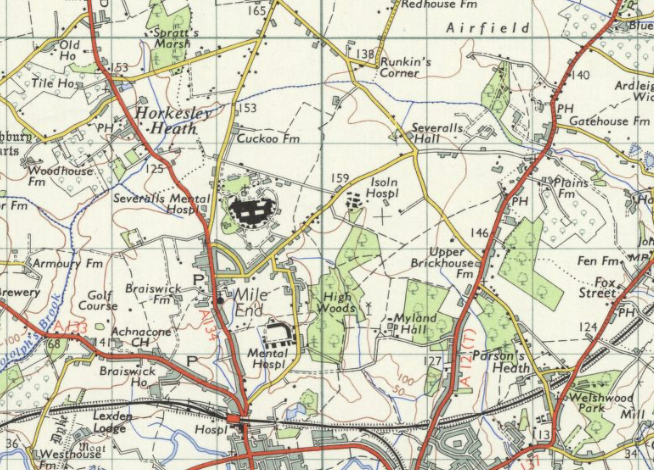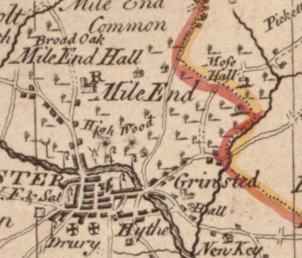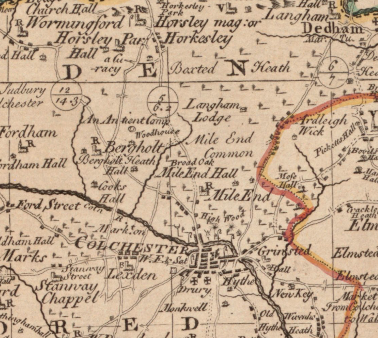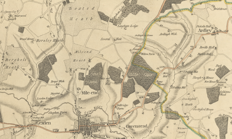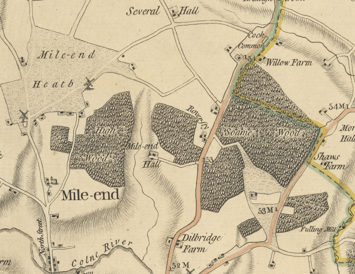 The map shows two windmills on the southern edge of the heath. Mile End Mill East, situated south of Mill Road was a post mill, that is where the superstructure revolves around a central huge supporting post so that the sails are always appropriately positioned in relation to the wind. The mill, erected in the 1760’s by John Matchett was destroyed by fire in 1807 but rebuilt. In 1832 it contained two pairs of stones and flour mill. In 1881 the mill was sold for £910 and the milling record ceased shortly afterwards.